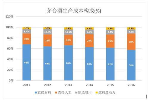 茅臺酒的生產成本包括原材料、人工、制造費用、燃料及動力四個部分。2011-2016年,直接材料占比從68%降至58%,直接人工占比則由20%增至30%。