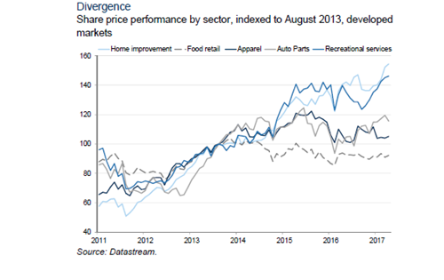 零售商大批破產的同時,一些對電商“免疫”的行業(yè),在過去幾年表現卻明顯優(yōu)于其他消費類行業(yè)。高盛在一篇報告中總結了以下四類:1、線下體驗型消費(如游樂場);2、“大件”商品和服務(如家具、教育);3、B2B類商品(如工業(yè)零件);4、有監(jiān)管約束的商品(如藥品)。