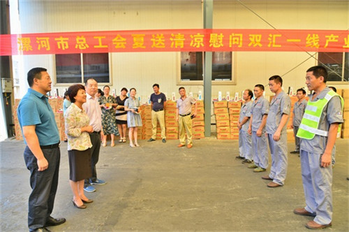 7月24日上午,烈日當頭,漯河市總工會黨組書記、常務副主席吳花蕾,市總工會副主席張煒一行在雙匯集團工會主席劉清德陪同下來到雙匯儲運公司慰問一線員工,為他們送去了飲水杯、毛巾、白糖、葡萄糖飲料等防暑用品,炎炎夏日里給廣大員工送去絲絲清涼。