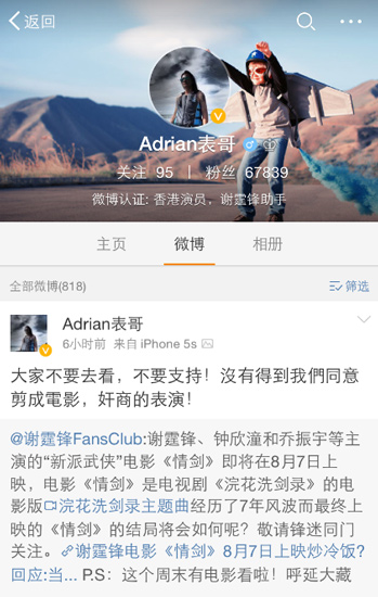 那么,《情劍》的兩位“主演”謝霆鋒與鐘欣桐為什么沒來宣傳本片呢?馬云對此表示:“兩位演員都還有別的戲要拍,沒時間來宣傳我們的電影?!钡皫兹崭勖絾柤傲藘扇说慕?jīng)紀人霍汶希,對方稱《情劍》片方根本沒有通知他們上映的事,更沒有邀請二人宣傳。而在微博上認證為“香港演員、謝霆鋒助手”的網(wǎng)友“Adrian表哥”也發(fā)微博指責片方并沒有得到謝霆鋒的同意,是奸商行為。另外,記者也查閱了《情劍》的官方微博,該官微在開辦至今僅發(fā)7條微博,有90個粉絲。可以說,《情劍》除了一組有“抄襲嫌疑”的海報之外幾乎是在沒有任何宣傳的情況下推進院線的。