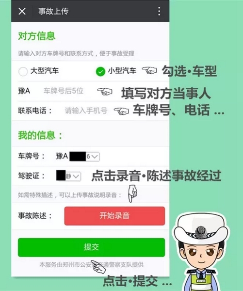 填寫“事故描述”相關內(nèi)容,輸入對方車號和聯(lián)系方式。并在事故陳述處點擊“開始錄音”,描述事故發(fā)生詳細地點和成因后提交。