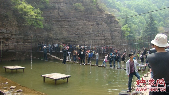 盡管鄭州的天氣忽冷忽熱還時不時的狂風大作,但是在這里天氣卻晴朗明媚,溫度也正好適宜外出游玩。當然,玩的嗨才是最關(guān)鍵的!景區(qū)內(nèi)除了誰都不會錯過的風景名勝外還有很多有趣的娛樂項目:比如過吊索:看起來簡單的吊索其實需要有很好的體力和身體協(xié)調(diào)力,一不留神就可能狼狽的掉入半米深的池水中。還有劃沖鋒舟,非??简瀳F隊的協(xié)作。不過最好玩的卻是在大巴車上,“樂活”的工作人員們把最自己具特色的電臺節(jié)目“知道不知道”搬上了大巴車,并邀請了電臺的明星主持亞楠來與大家互動,把無聊的旅途變得趣味橫生。
