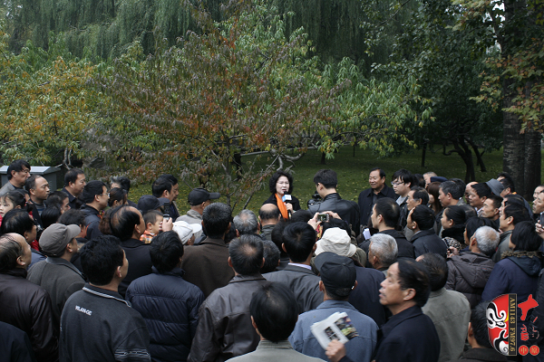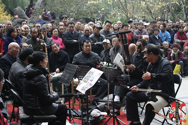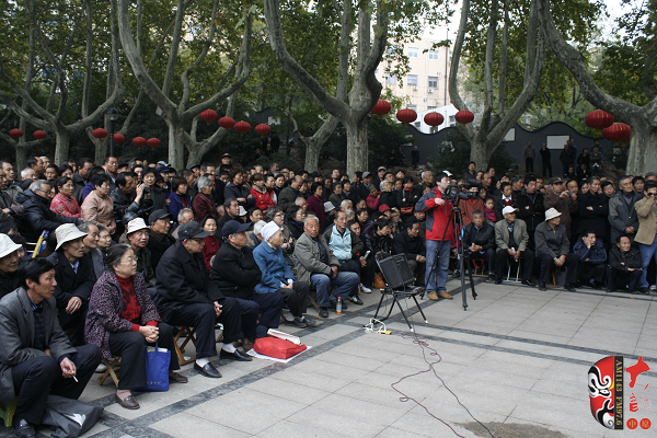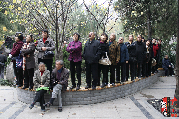 觀眾當(dāng)中,有從廣播中得知消息早早就趕來(lái)的戲迷,也有周末游園駐足的市民?;顒?dòng)原計(jì)劃九點(diǎn)半開(kāi)始,在現(xiàn)場(chǎng)戲迷們的熱情要求下,活動(dòng)主辦方之一——鄭州梓軒藝術(shù)團(tuán)的團(tuán)員們九點(diǎn)剛過(guò)便開(kāi)始了暖場(chǎng)演出。 這是一個(gè)由戲迷自發(fā)組織的藝術(shù)團(tuán),他們經(jīng)常在公園演唱,為廣大戲迷所熟悉和喜愛(ài),也為豐富群眾的業(yè)余文化生活做出了很大的貢獻(xiàn)。