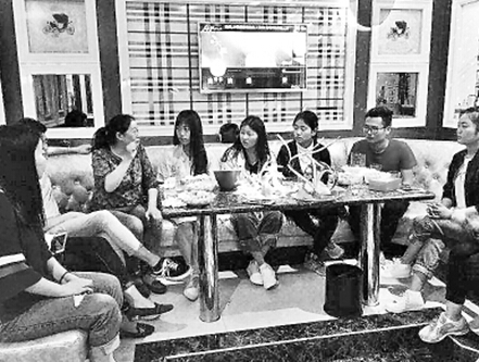 “我們這里確實(shí)接待過(guò)一個(gè)大學(xué)的師生,他們當(dāng)時(shí)用了兩個(gè)大包房?!彼侮?yáng)向記者證實(shí)了網(wǎng)友們的傳言?!爱?dāng)時(shí)我正在唱歌,到衛(wèi)生間方便時(shí)突然看到一群學(xué)生打扮的人擁入了KTV,一問(wèn)才知道是來(lái)這里上課的?!变鸷印案璋浴睆埮空f(shuō)。