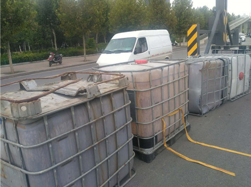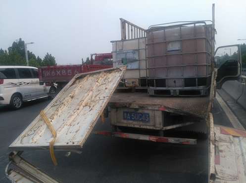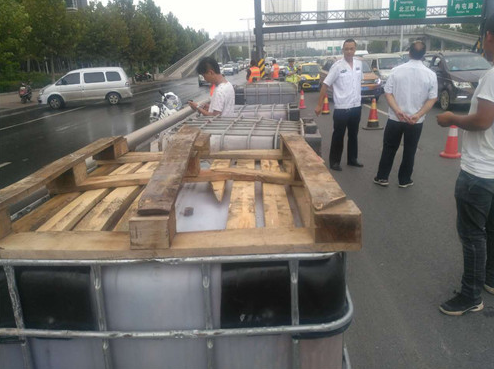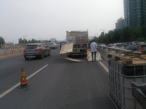 據(jù)貨車司機(jī)介紹,他車上拉的這些邊長(zhǎng)約1米的方形大桶是裝醬油用的,當(dāng)天拉著這些空桶從新鄭來(lái)到鄭州,因?qū)β窙r不熟,不知道此處上橋口有3米的限高桿,直到上橋時(shí)撞上限高桿后,才知道貨車不讓上三環(huán)立交橋。