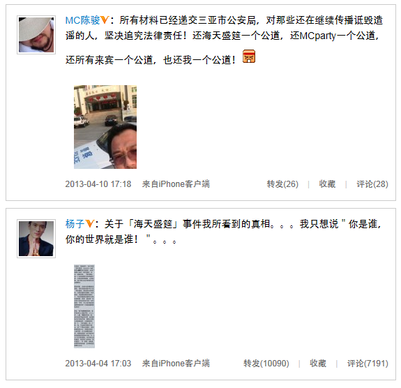 近幾日,三亞“海天盛筵”涉黃,淫亂派對的新聞可謂瘋傳網(wǎng)絡(luò)。早前有媒體報(bào)道,三亞市委宣傳部曾于4月4日向媒體發(fā)布新聞通稿,稱已經(jīng)對網(wǎng)上有關(guān)“海天盛筵聚眾淫亂”傳聞?wù)归_調(diào)查,對此事非常重視。三亞警方今日已正式通知“海天盛筵”主辦方三亞鴻洲國際游艇會、“MC白色派對”主辦方MC俱樂部等相關(guān)單位負(fù)責(zé)人于4月8日面談,配合調(diào)查工作。今天,“海天盛筵”主辦方之一,候鳥俱樂部負(fù)責(zé)人陳駿發(fā)微博稱,自己已經(jīng)將所有材料遞交三亞市公安局,將對那些還在繼續(xù)傳播詆毀造謠的人,堅(jiān)決追究法律責(zé)任。希望可以還海天盛筵一個公道。