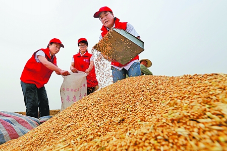 6月7日,在安陽(yáng)縣倫掌鎮(zhèn)孫家崗村,青年志愿者正在幫助困難戶收麥子。畢興世 李鵬飛 攝