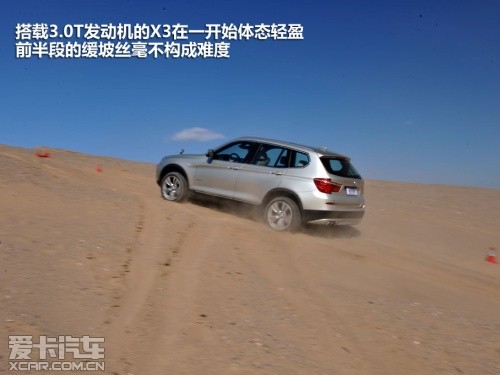 或許是奧迪Q5完成測(cè)試的過程比較順利,我們對(duì)接下來即將登場(chǎng)的寶馬X3也普遍比較看好,這或許就是思維慣性帶來的固定套路吧。然而在實(shí)地測(cè)試過程中,這臺(tái)X3攀爬沙丘的過程卻沒有表現(xiàn)出它在公路上所煥發(fā)出的霸氣。400?!っ椎淖畲笈ぞ卦诔鞘械缆分校踔猎诟咚俟飞隙际菬o與倫比的,但移步至眼前狂風(fēng)大作的沙丘,這400?!っ椎呐ぞ貏t像是心有余而力不足的悲情英雄。