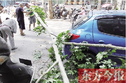 原來,當天下午1點25分,張先生和朋友一起吃飯,將自己的標致207轎車停在了鄭州市靠近文化路的緯一路上,不料,幾分鐘后,一根長約六米的樹枝從天而降,將他的車后窗玻璃砸爛,車身也被砸凹了。