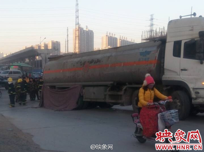今天(1月19日)早上7點20分左右,鄭州市中州大道航海路上,一輛油罐車將一騎電瓶車男子碾倒在車下,事故現(xiàn)場被布遮擋,估計很慘。目前罐車司機已被控制住,事故還在處理中。