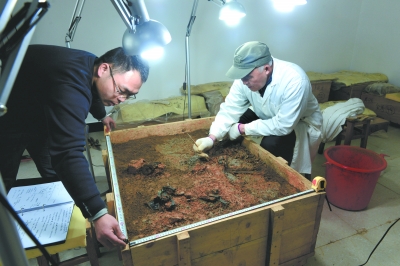 考古現(xiàn)場在緊張有序地準(zhǔn)備主棺柩吊運(yùn),實(shí)驗(yàn)室則在有條不紊地對先前發(fā)掘的文物進(jìn)行考古,主棺吊運(yùn)、文物清理保護(hù)兩不誤。這幾天,在文保用房里, 工作人員正在對偶車馬進(jìn)行清理記錄。據(jù)悉,清理中的偶車馬是先前在主墓甬道中發(fā)現(xiàn)的。工作人員在做每一層清理時,都會留下豐富的資料,包括影像拍攝、文字 記錄、圖表繪制等。偶車馬的清理發(fā)掘,對研究西漢列侯出行制度有很大參考價值。