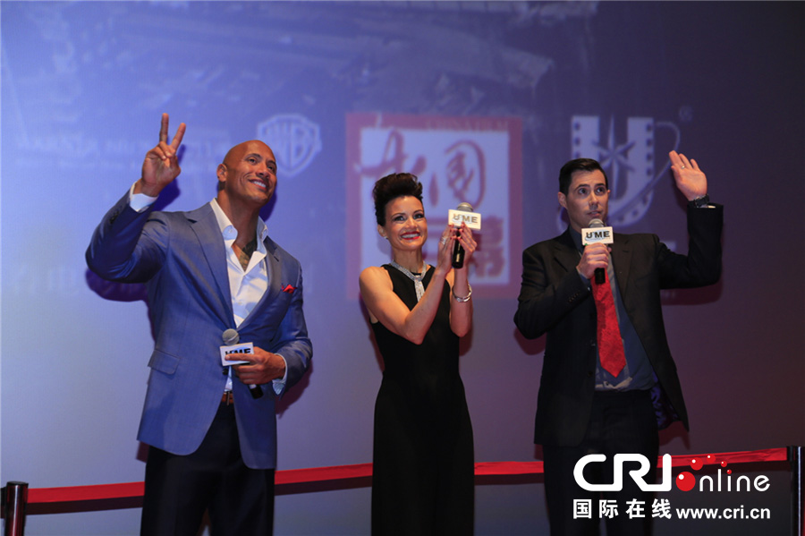 紅毯結(jié)束后,影城內(nèi)舉行了超前點(diǎn)映及映前見面會(huì),三位主創(chuàng)親臨影城現(xiàn)場(chǎng),與場(chǎng)內(nèi)影迷交流互動(dòng)。提及將要上映的《末日崩塌》,導(dǎo)演佩頓、卡拉、強(qiáng)森各自分享了影片的臺(tái)前幕后花絮,并在現(xiàn)場(chǎng)提前解讀了影片的“震撼”視效和“家庭”特質(zhì)??ɡ劦剑骸霸谶@樣一部宏大的災(zāi)難片中,很難得有走心的部分,無(wú)論即將離婚的夫妻情,還是牽動(dòng)人心的父女情,以及母女情,都非常細(xì)膩動(dòng)人。”同時(shí)卡拉也不忘提醒在場(chǎng)觀眾:“看電影時(shí)一定記得喘氣,千萬(wàn)別憋過(guò)去?!睆?qiáng)森對(duì)于這部電影則非常興奮和自信:“你們一定會(huì)愛死這部電影?!倍粏柤皠倓偟氖子臣t毯,強(qiáng)森表示,粉絲的數(shù)量之多和熱情之高給他留下了非常深刻的印象,導(dǎo)演佩頓更直呼:“這次中國(guó)之行,感覺太興奮,中國(guó)的粉絲太熱情了。”