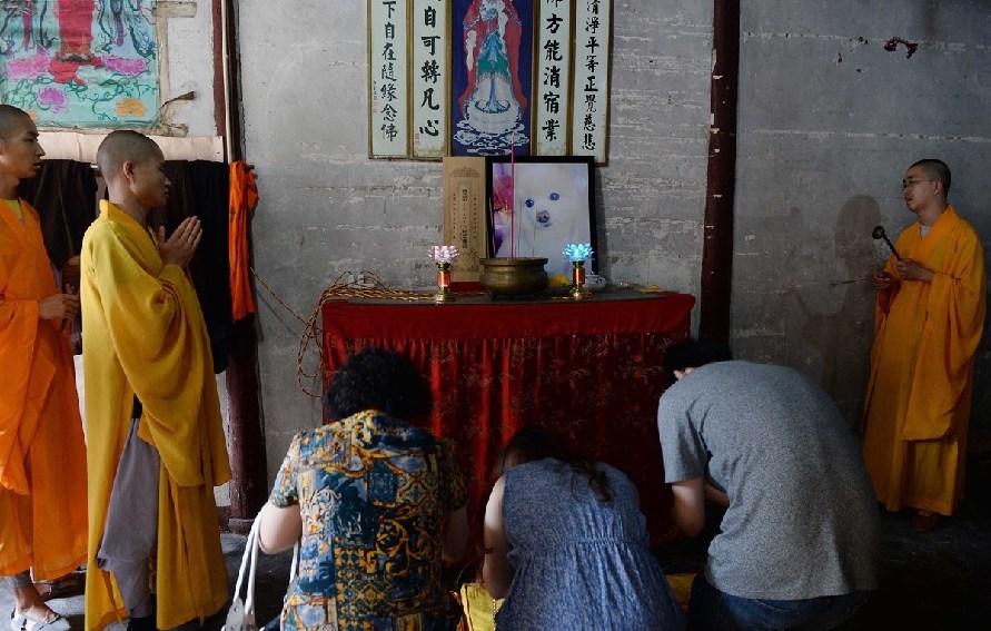 周近夏認(rèn)為,自己的服務(wù)理念賣的是火化之外的事情,追悼儀式就是其中之一。從2011年成立釋友寵物殯葬至今,不少名人通過口口相傳找到周近夏的店為自己的寵物處理后事。圖為寵物狗的遺像被擺放在寺廟中。
