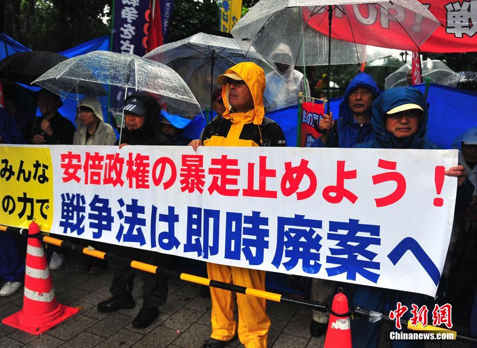 隨著安倍陣營強(qiáng)推以解禁集體自衛(wèi)權(quán)為核心內(nèi)容的安保法案最終過關(guān)的計劃進(jìn)入“倒計時”,日本民眾的反安保抗議活動再度進(jìn)入高潮。在之前徹夜抗議之后,9月17日白天,又有眾多日本民眾冒著大雨持續(xù)聚集在國會周邊進(jìn)行抗議活動。中新社發(fā) 王健 攝