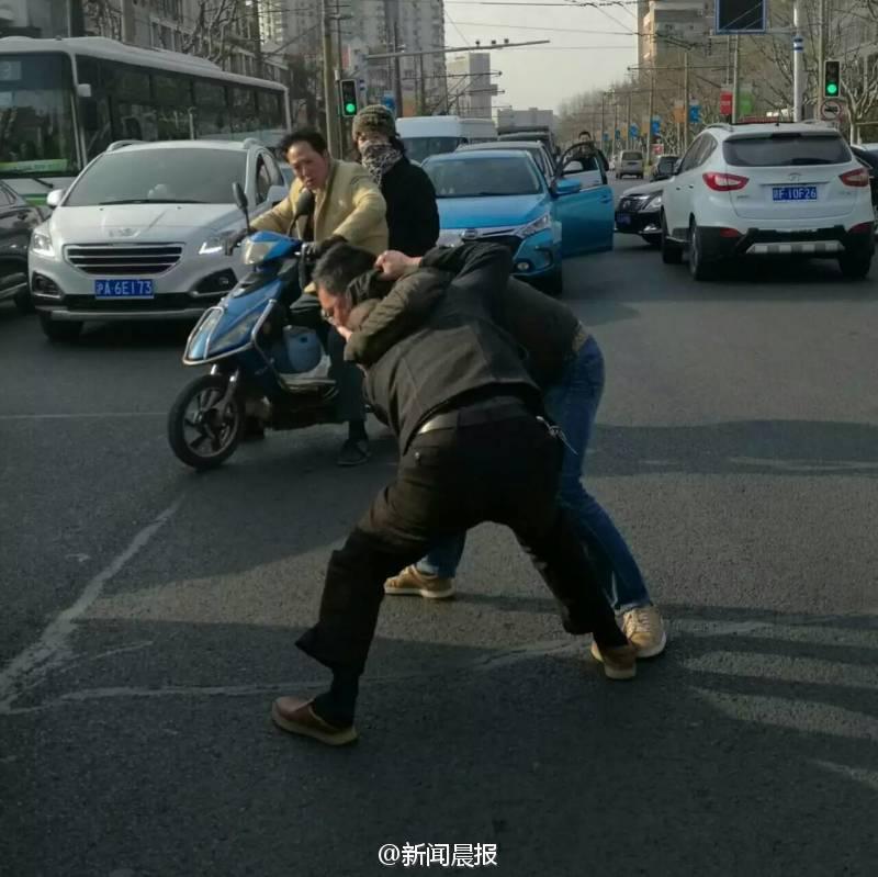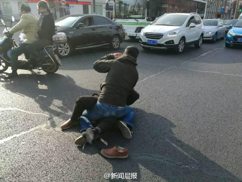 晨報(bào)訊 你一個過肩摔,我一個橫掃腿,接著扭打在一起,互相纏斗難分伯仲……這幕刺激的武打動作場景,昨天早高峰時在上海安波路營口路上演,而沖突竟源于“路怒”!目擊者肖先生告訴記者,昨天上午8點(diǎn)不到,他經(jīng)過安波路、營口路路口時,看看兩名男子扭打在一起,場面十分激烈。“我順勢拿出手機(jī)拍了幾張照片,旁邊也有行人上去勸架。”肖先生說,在兩名男子的身旁,一橫一豎停著兩輛轎車,“我想可能是兩個人開車有點(diǎn)摩擦引起的‘路怒’吧?!?/font>