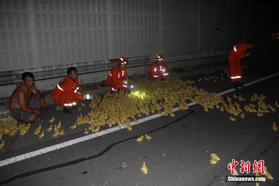 7月26日凌晨,在京臺高速滕北出口往南路段發(fā)生一起車禍,一輛裝滿鴨苗的廂貨車與半掛車發(fā)生追尾,車上3人被困,數(shù)千只鴨苗散落在高速路上。山東省棗莊市滕州消防大隊接到報警后迅速出動,對高速路面上的鴨苗進行了驅(qū)趕,疏通高速交通,及時營救出車上被困人員。中新社發(fā) 季龍 攝 圖片來源:CNSPHOTO