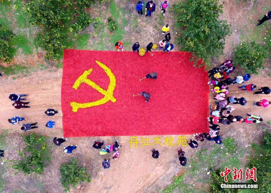 11月6日,南水北調(diào)中線工程水源地——河南淅川丹江大觀苑,滿園的桔子喜獲豐收,枝頭上碩果累累,多位農(nóng)民在桔子地里用豐收的金黃桔子和當(dāng)?shù)氐奶禺a(chǎn)紅辣椒拼成鮮艷奪目的巨幅黨旗。一位農(nóng)民告訴記者,為了拼這幅圖案,他們十幾個人整整用了兩天時間。吳揚 攝