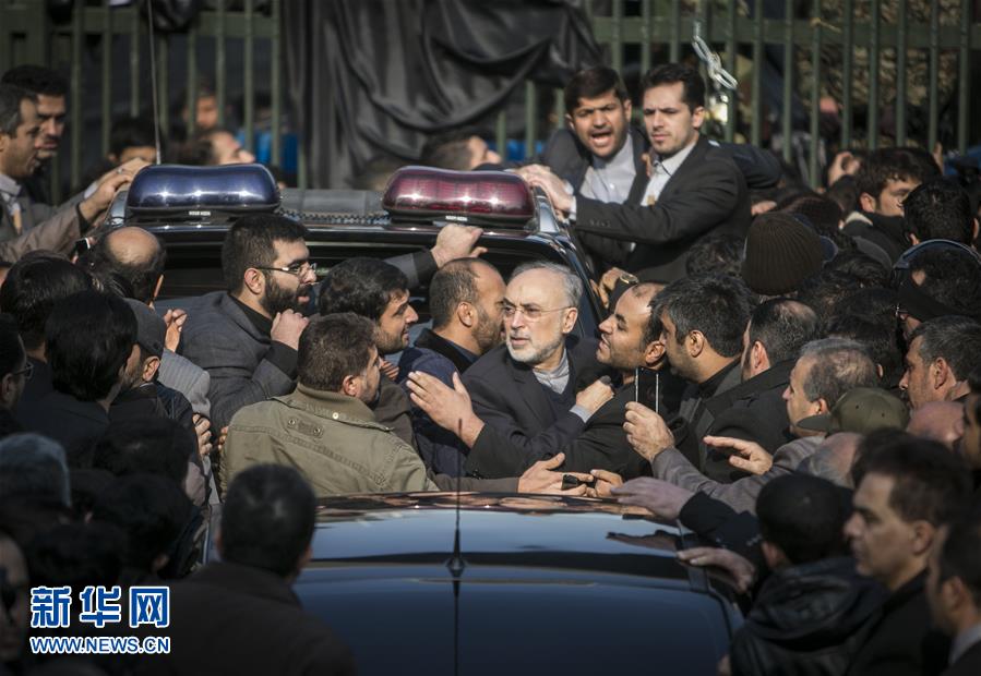 1月10日,在伊朗德黑蘭,伊朗原子能機(jī)構(gòu)主席阿里·阿克巴爾·薩利希(中)送別伊朗前總統(tǒng)阿克巴爾·哈什米·拉夫桑賈尼。新華社發(fā)(艾哈邁德·哈拉比薩斯攝)