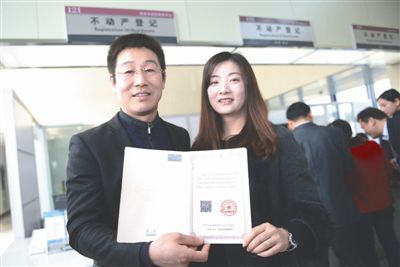 3月1日,在江蘇徐州市不動(dòng)產(chǎn)登記交易服務(wù)中心,市民邢衛(wèi)鋒、趙媛媛夫婦在展示編號(hào)為001的不動(dòng)產(chǎn)權(quán)證書。當(dāng)日,《不動(dòng)產(chǎn)登記暫行條例》開始施行。國土資源部部長姜大明在江蘇徐州市為申請(qǐng)領(lǐng)證的市民頒發(fā)了全國第一本不動(dòng)產(chǎn)權(quán)證書。新華社發(fā)
