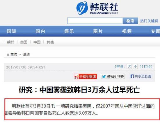 韓聯(lián)社的意思似乎是:連中國學者做的研究都能證明,韓國人的健康被中國霧霾所傷。