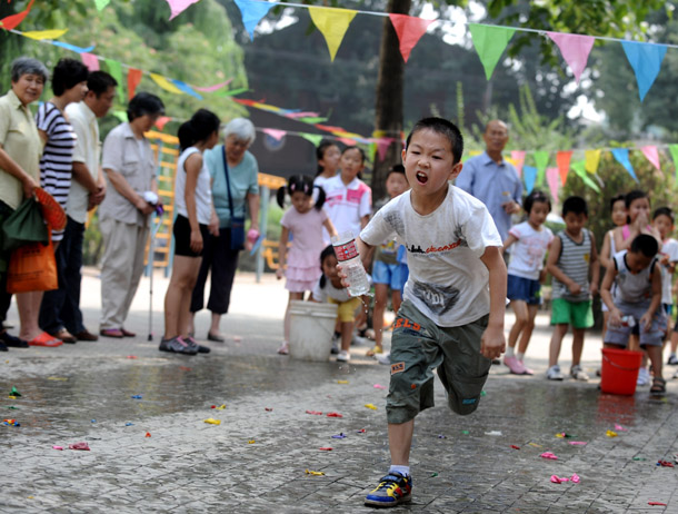 游戲規(guī)則:跑道前方設(shè)置一個水桶 起點外設(shè)置一個大塑料瓶,比賽開始時,小朋友持水杯到水桶內(nèi)盛水后返回倒入大塑料瓶處,由孩子和兩個家長依次進(jìn)行盛水接力,大塑料瓶盛滿水者為勝(注:塑料瓶身內(nèi)設(shè)若干漏點)。活動共7個家庭參與,取前三名進(jìn)行頒獎,所有參與的家庭均有參與獎。