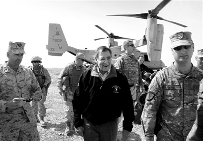 14日,正在阿富汗訪問的美國國防部長帕內(nèi)塔乘軍機(jī)抵達(dá)一處軍事基地