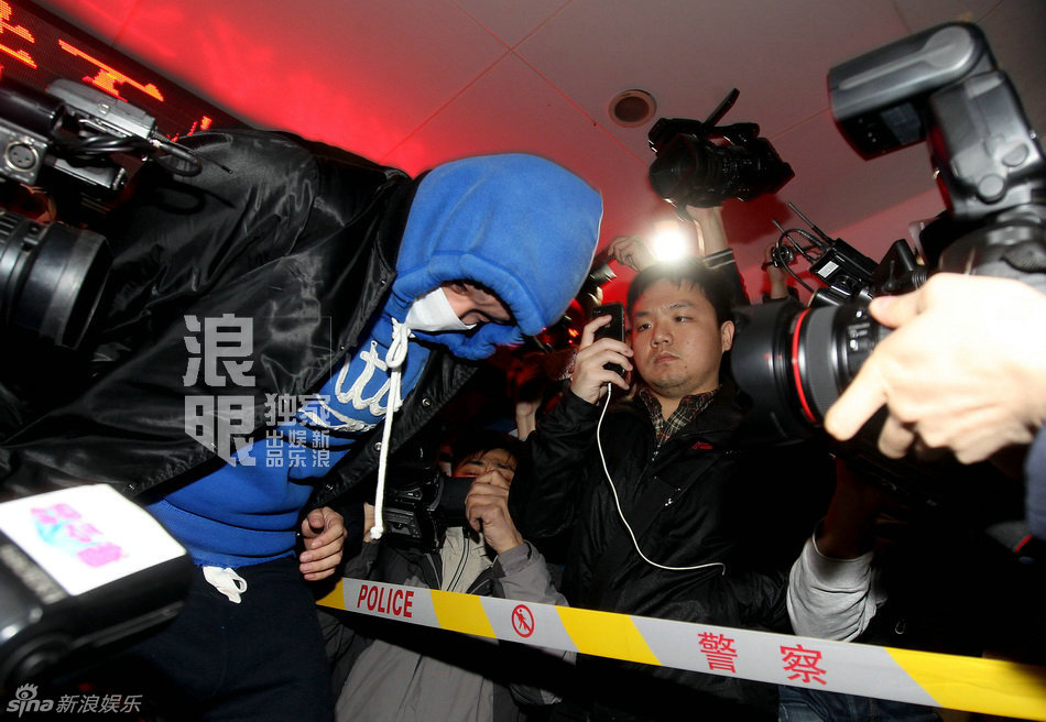 歌手李代沫吸毒被調(diào)查,18日晚,記者在派出所等候已久后,李代沫與警察現(xiàn)身派出所門口。李代沫戴帽衫蒙面低調(diào),拷著手銬被押解到朝陽(yáng)分局。(鄭福德/圖)
